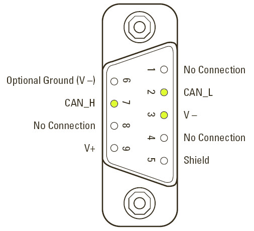 Parallel-stekker van NI-CAN module: pin 7 en 2 zijn het CAN-signaal.