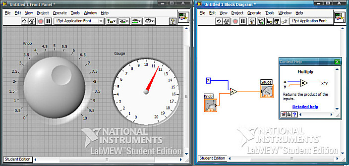 LabVIEW is een software-pakket van National Instruments dat ons in staat stelt te werken met Virtuele Interfacen. Zo kan informatie in een computer ingelezen OF gesimuleerd worden, en vervolgens door een reeks berekeningen aangepast worden en omgezet naar een uitvoer of simulatie. Bijvoorbeeld: We simuleren een draaiknop en laten een wijzertje op het scherm het dubbele van de waarde van de draaiknop aannemen, OF we sluiten een echte draaiknop en een echte wijzerplaat aan op de PC (met behulp van een seriele of parallelle module) en laten deze net hetzelfde doen. Dit is een van de meest simpele mogelijke opstellingen in LabVIEW. Voor ons project zullen een reeks ingewikkeldere procedures aan bod komen.