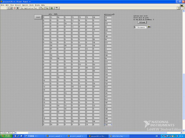 Om de informatie die op het CAN-systeem van een wagen zit in te lezen in de PC hebben we een USB-module gebruikt van National Instruments, de "NI-CAN 8473-USB", deze stelt ons in staat de info op het CAN-netwerk in te lezen op de PC in LabVIEW. Elke functie heeft zijn unieke code (van 0 tot ongeveer 1600 decimaal), dit noemen we (Arbitrage-)Identifiers omdat ze de functie identificeren. Elke identifier wordt weergegeven samen met de hexadecimale waarde die hij op dat moment heeft, elke waarde beschrijft een toestand. Hier zie je zo een lijst met identifiers en hun waarde op een specifiek moment, de waarde kan tot 500 000 keer per seconde veranderen.